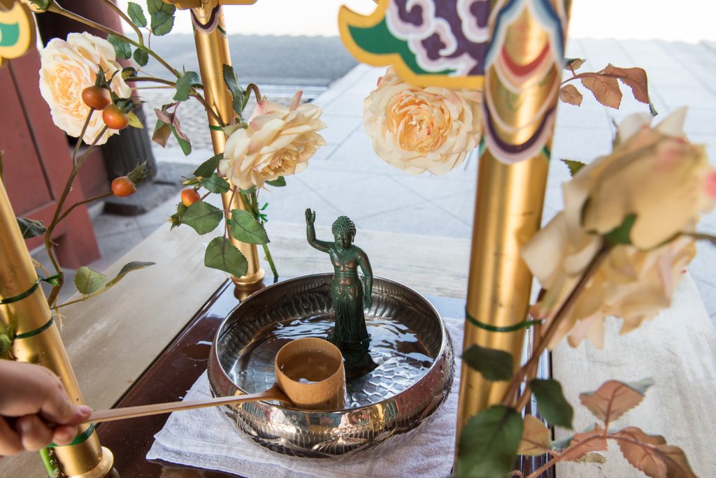お釈迦様の誕生を象徴する「誕生仏」に甘茶をそそぎ、心静かにその教えに感謝を捧げます。